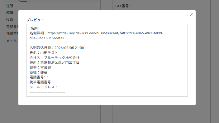 以下は名刺詳細データのチャット共有を例にご紹介しております。取引先詳細、取引先担当者詳細の場合も基本形式は同じです。