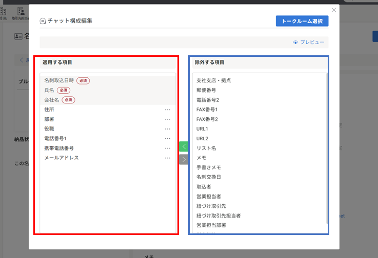 名刺詳細、取引先詳細、取引先担当者詳細の各データ項目を自由にカスタムしてお好きなチャットルームに共有することができます。